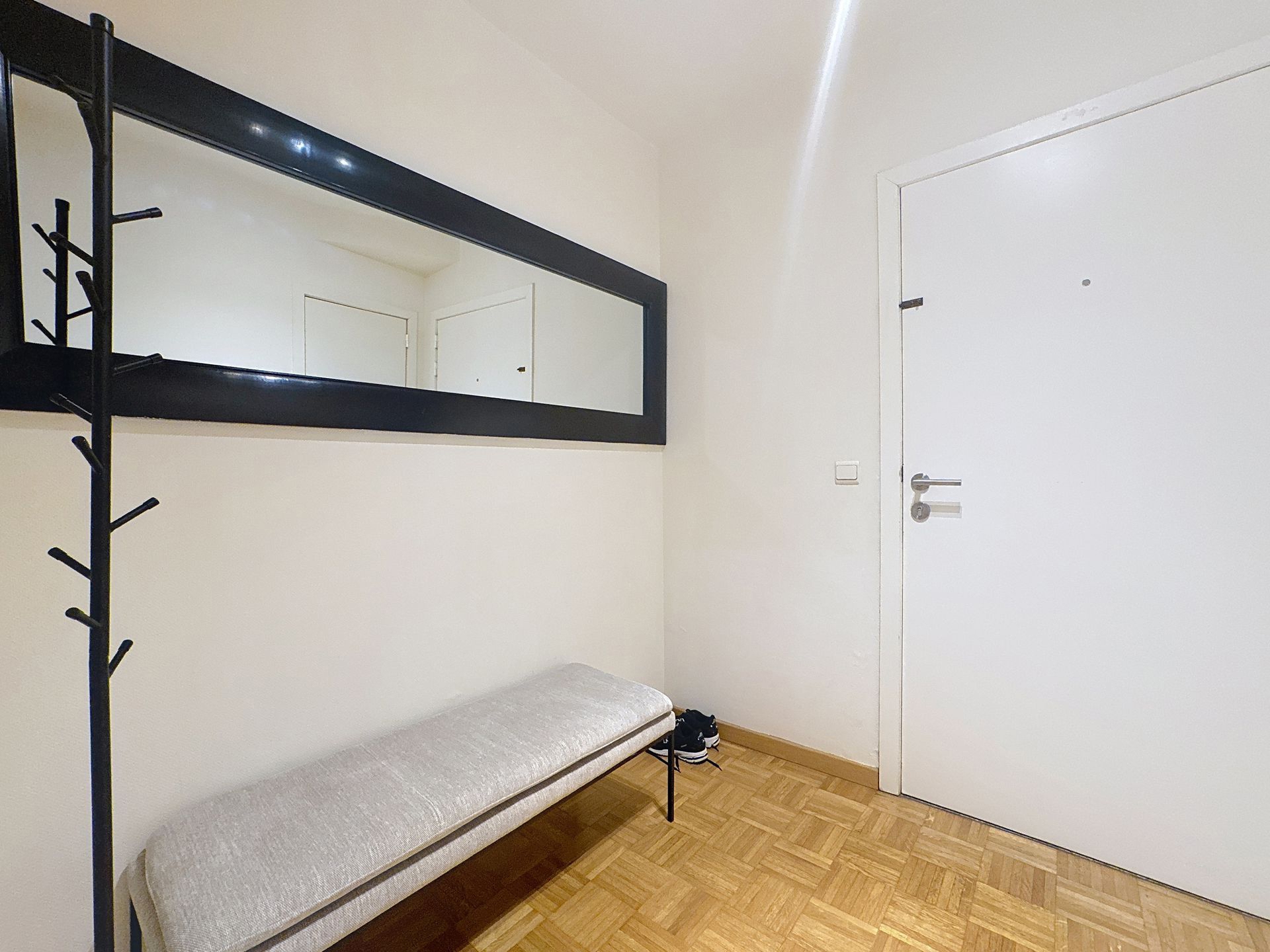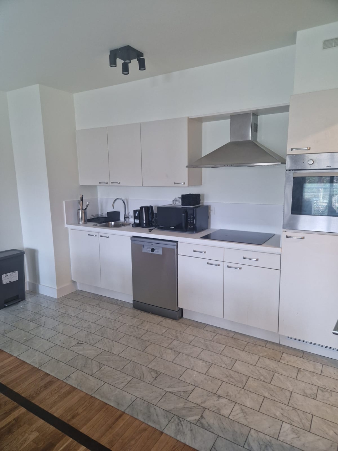- 1 beau living en parquet avec cuisine super équipée ouverte (33,5m²)