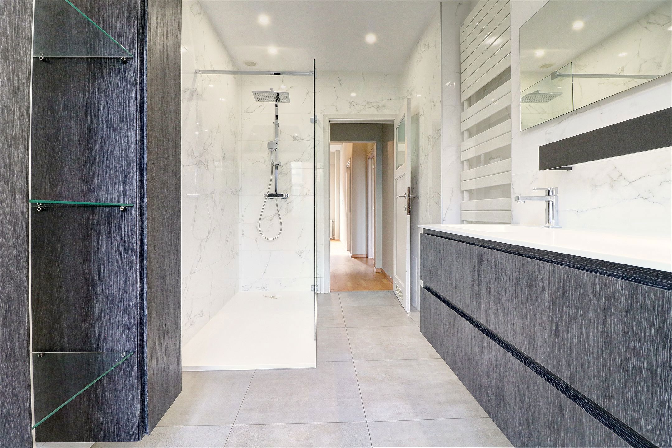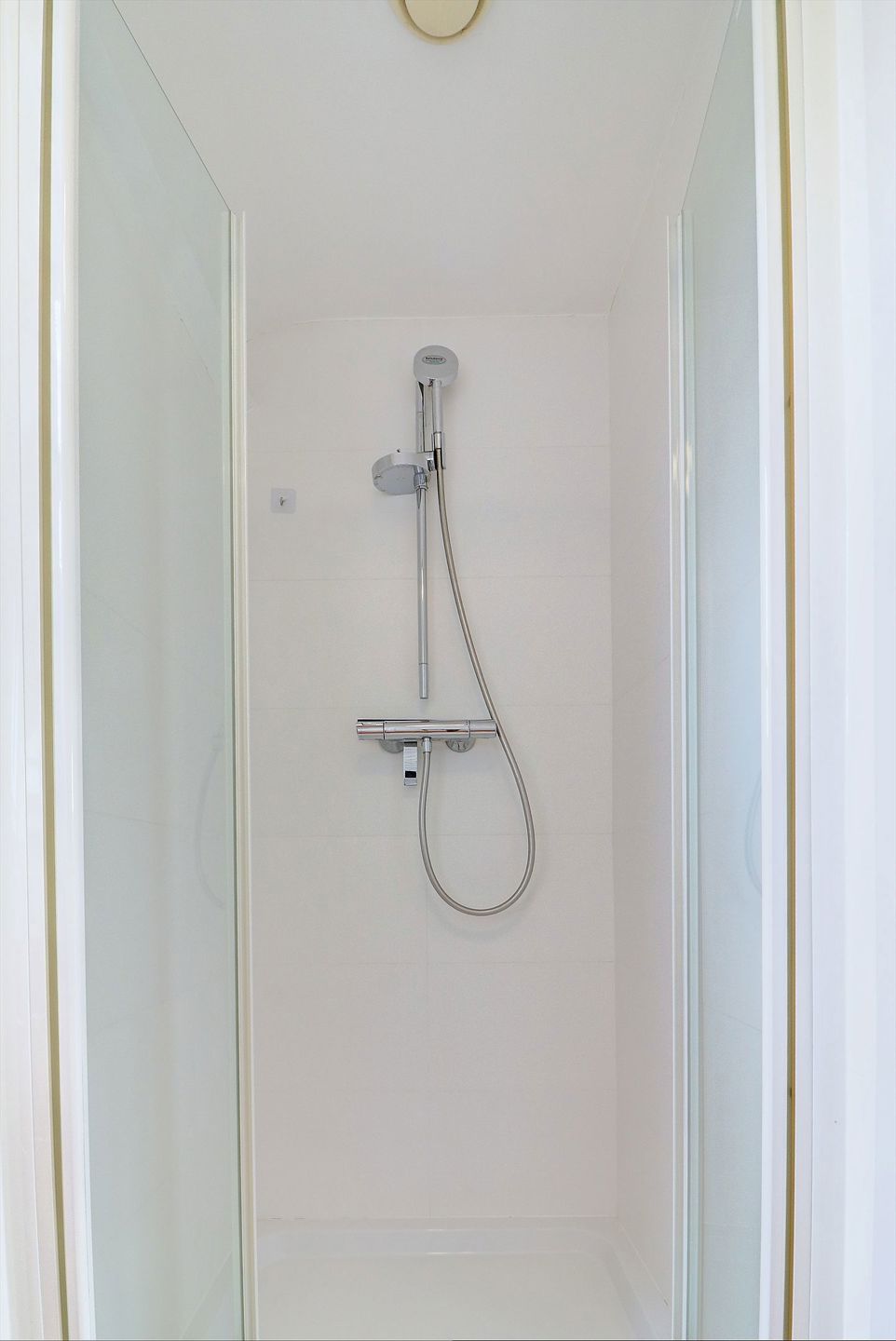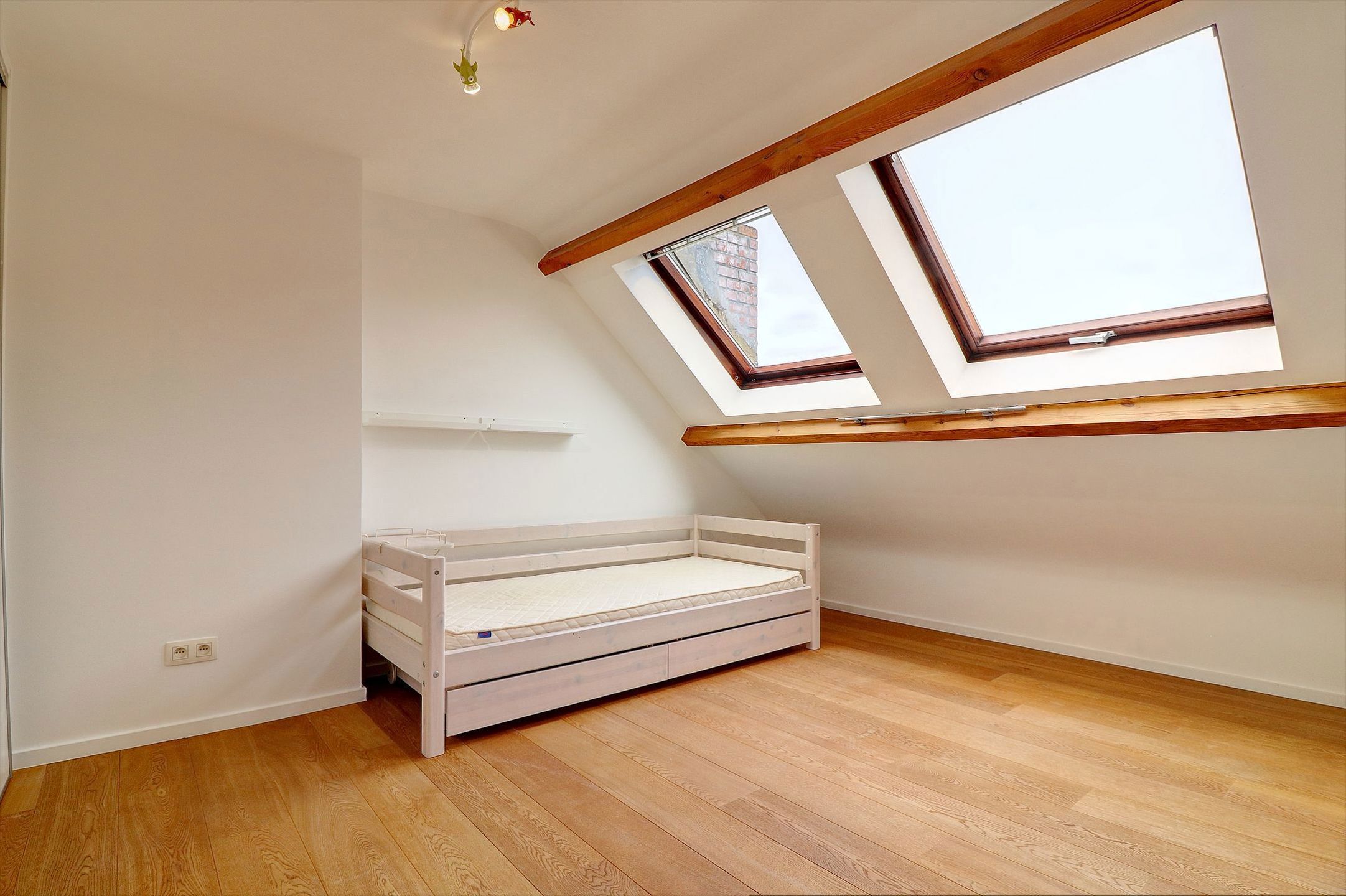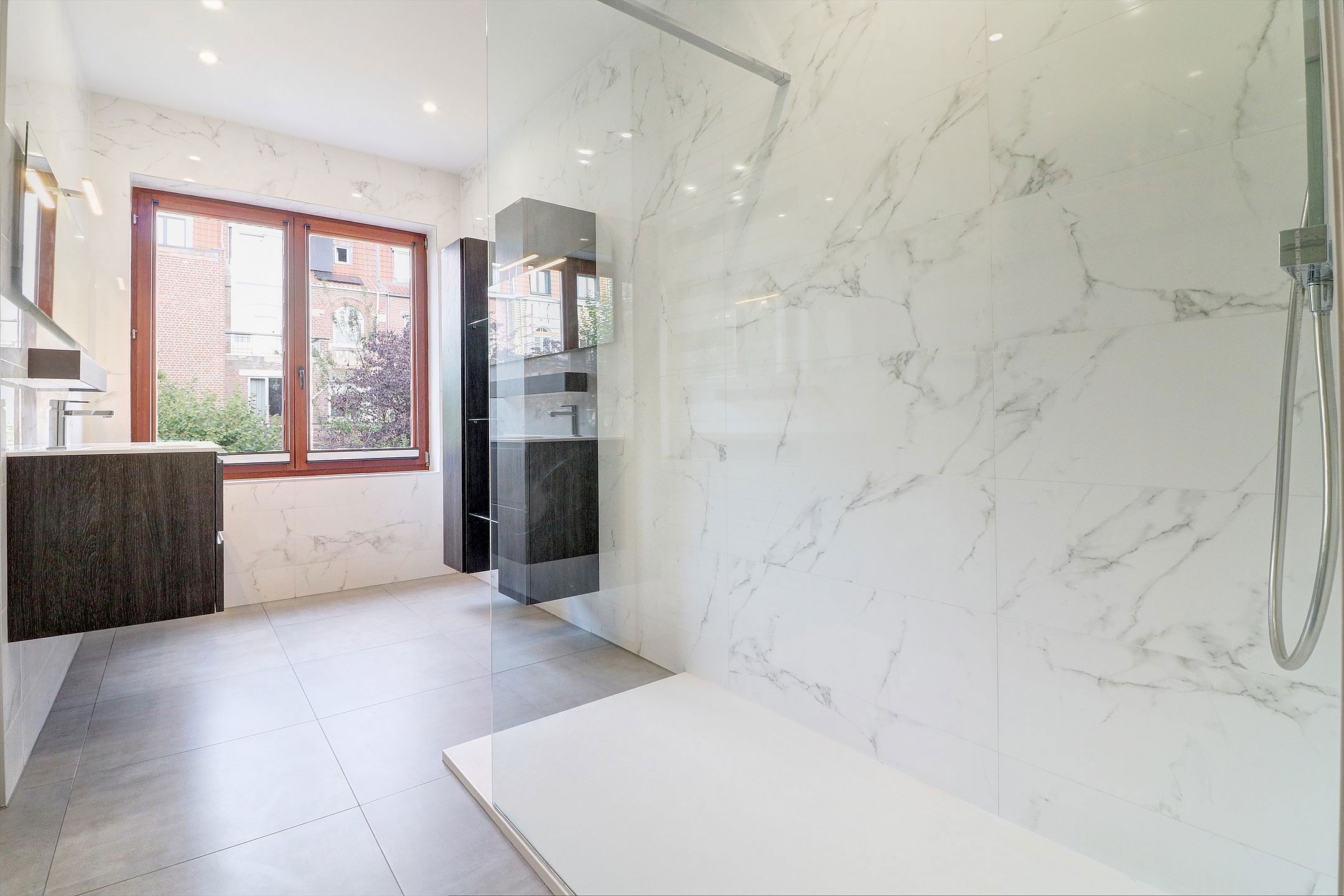 - 1 hall de nuit de ±14m², 2 chambres en parquet de ±18m² chacune, 1 salle de douche carrelée de ±9m² avec une grande douche italienne, 1 WC séparé