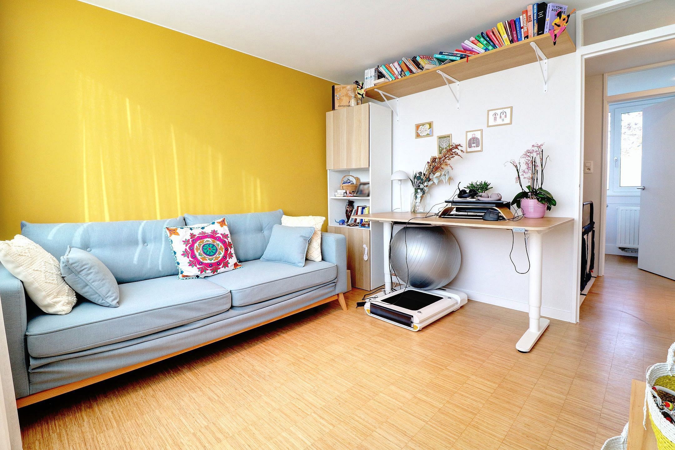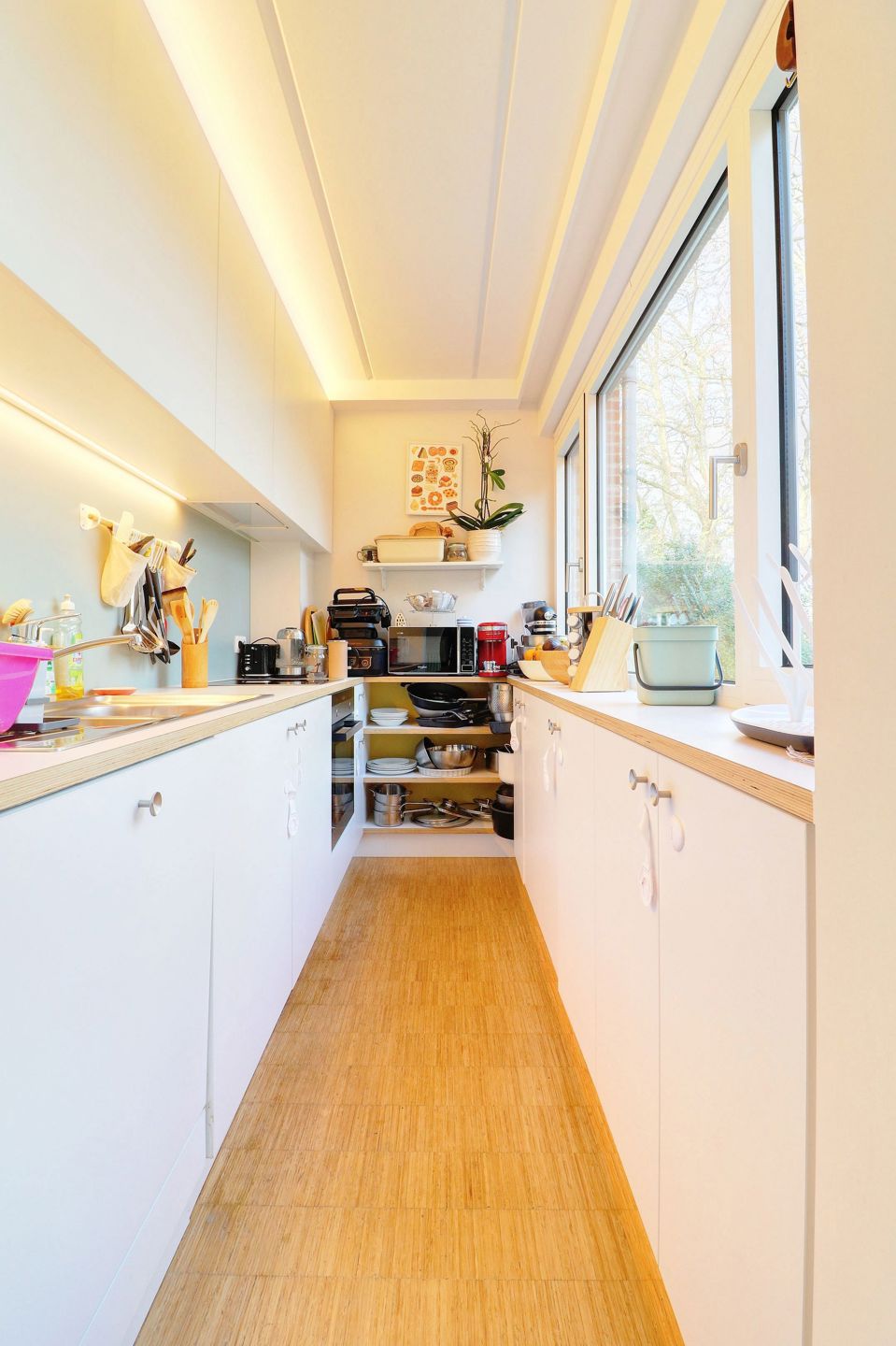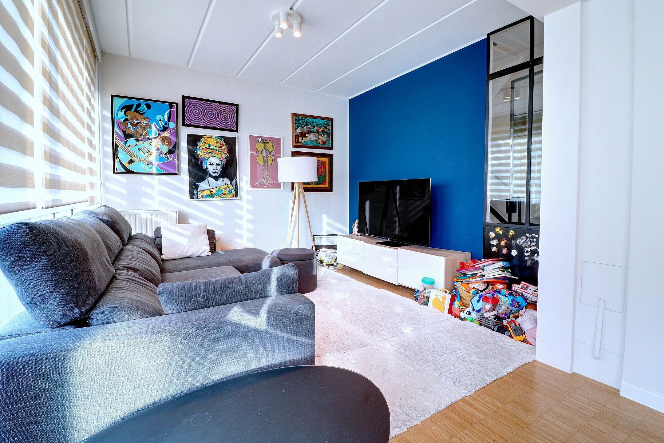 1er étage : hall, un salon - salle à manger en L de +- 42m² avec du parquet en bambou, une cuisine ouverte équipée.