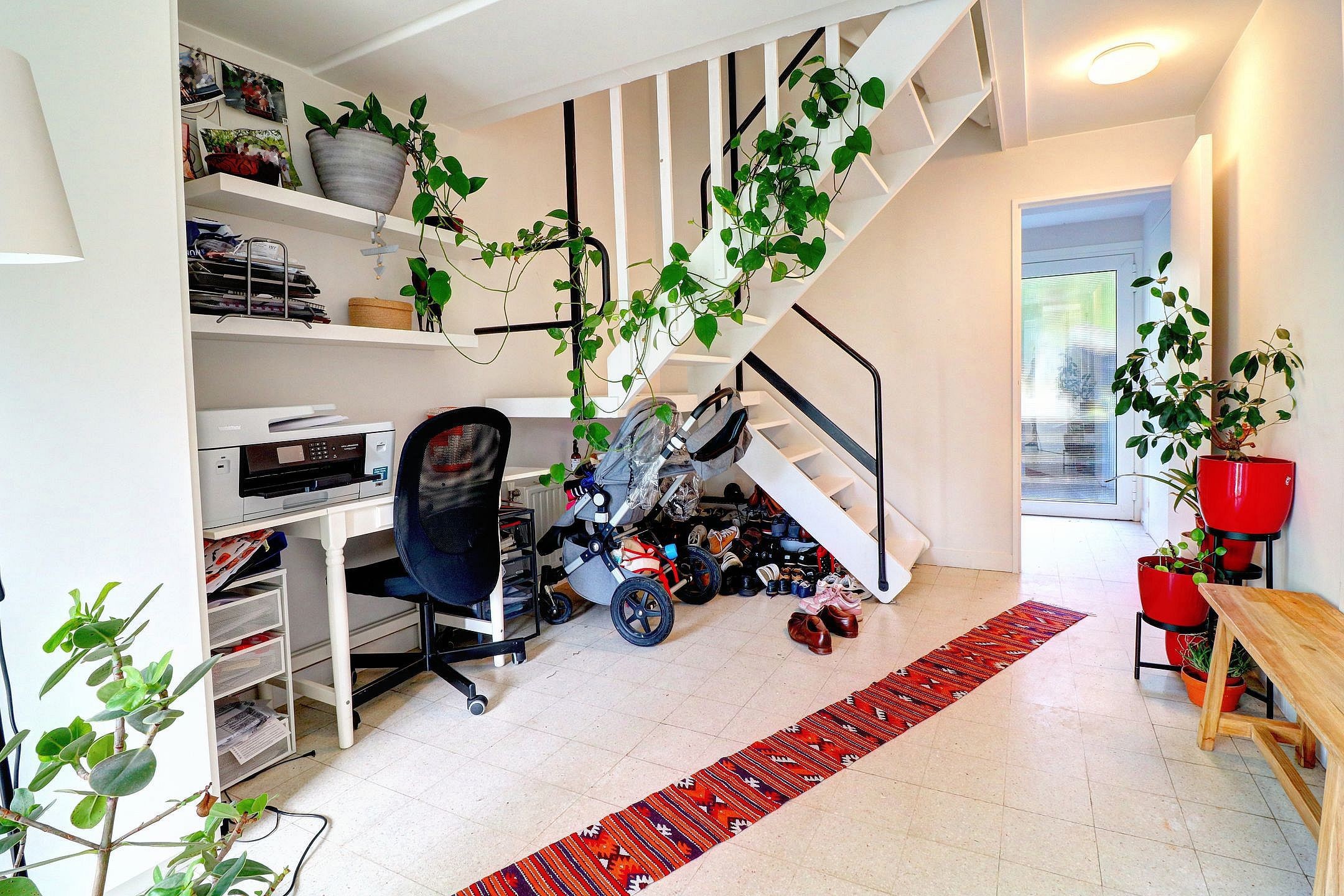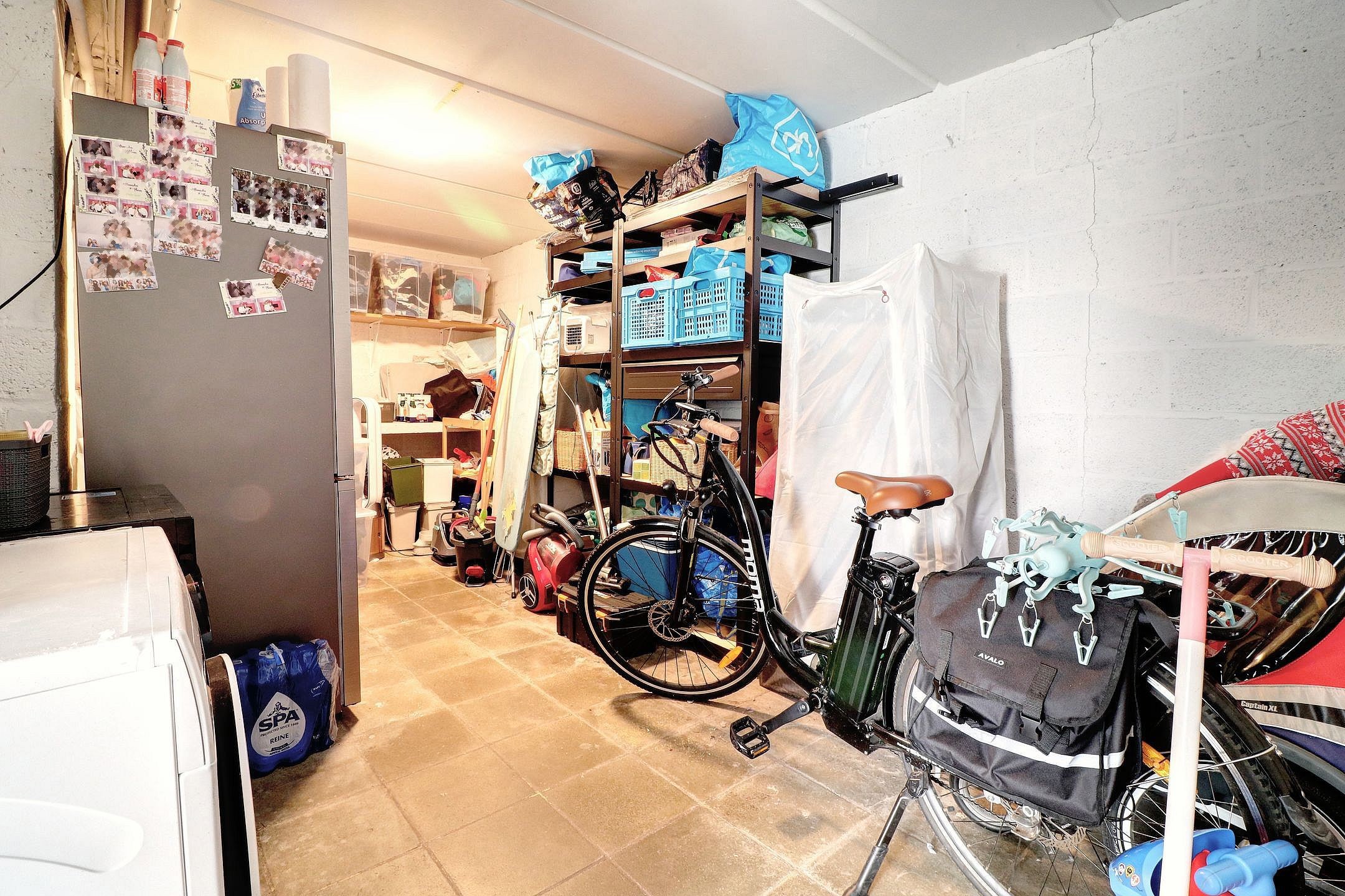 rez: Hall d'entrée spacieux avec toilette, une cave, un garage pour 1 voiture + machine à laver et séche-linge + un emplacement extérieur. Accès au jardin de110m² et à la terrasse de 30m² orientée N-O